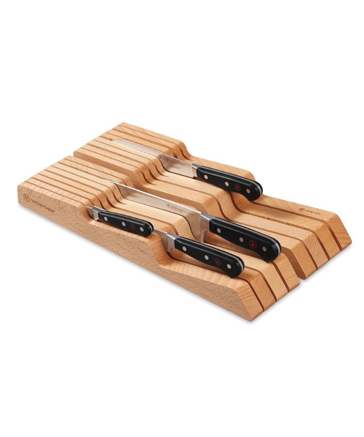 This in-drawer knife tray is an ideal way to safely store your cutlery without taking up valuable counter space. The WÜSTHOF Large In-Drawer Knife Tray is made of beech wood and can hold up to 14 knives.