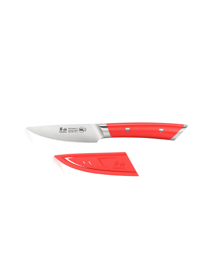 The HELENA Series is an elegantly minimalist interpretation of the modern kitchen knife. A slim, semi-bolster perfectly balances the knife's full tang while complementing the sleek, smooth lines of the handle. Two stain-resistant steel rivets solidly fasten the ergonomic handle to the blade, providing a secure, comfortable grip. Every blade is forged from high-alloy German X50CrMoV15 steel and meticulously heat-treated, ensuring a razor-sharp edge with exceptional durability and edge retention.