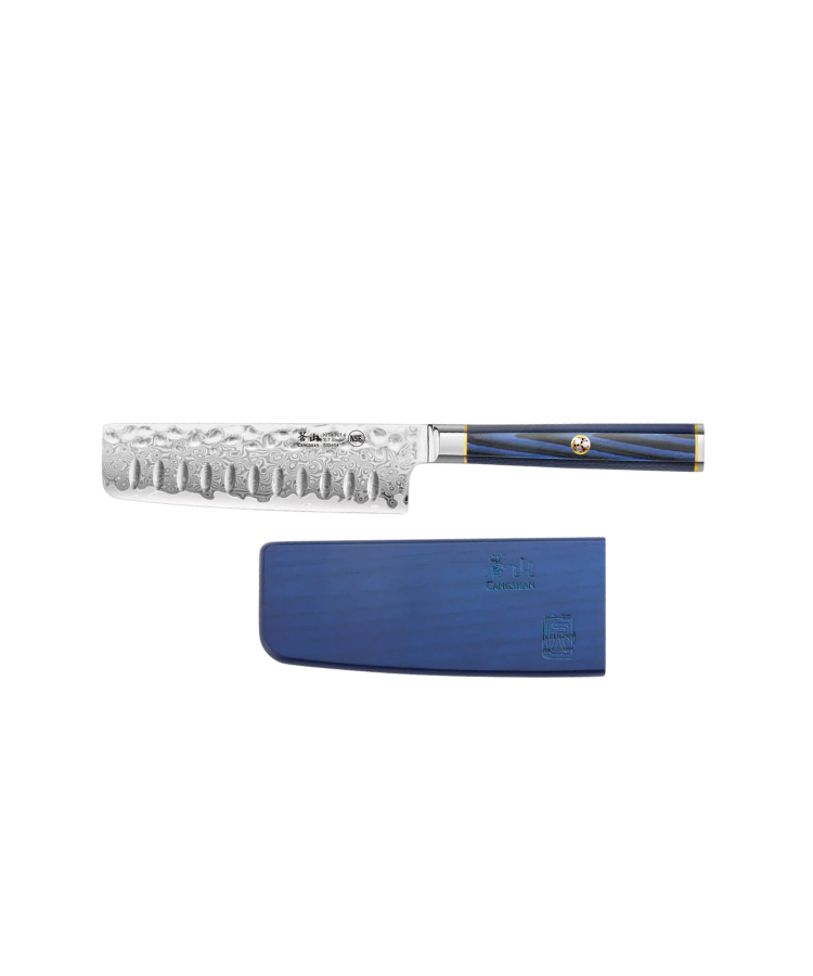 The KITA Series is a bold statement of traditional design coupled with innovative materials. Exceptionally sharp and striking in design, these hand sharpened knives feature a unique hammered texture across the face of the high alloy X7 full tang blades. Beautiful blue G-10 fiberglass perfectly highlight the comfortable octagon shaped handle while allowing the distinct mosaic pin to shine. Each knife comes with a deep blue wood magnetic Saya-style sheath that makes storage secure and easy.