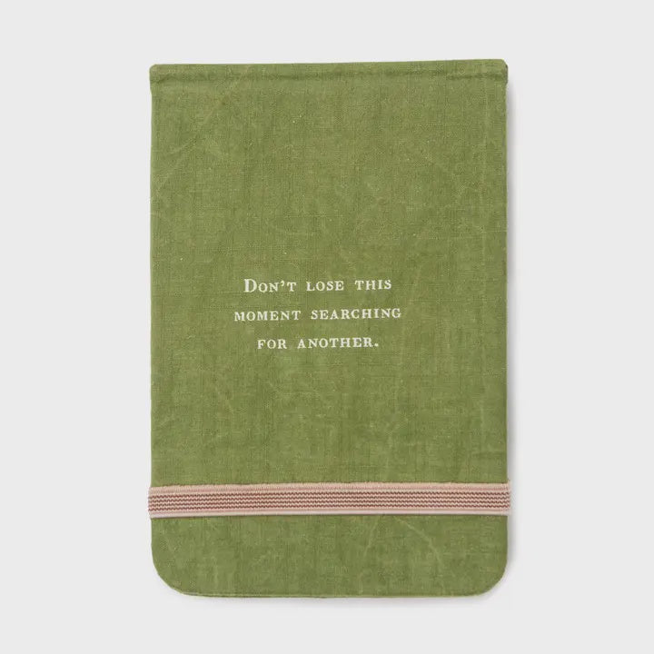 These fabric notebooks contain lined pages and have an elastic band at the bottom to keep everything in place! Quote: "Don't lose this moment searching for another." Dimensions: 3.5" x 5.5"
