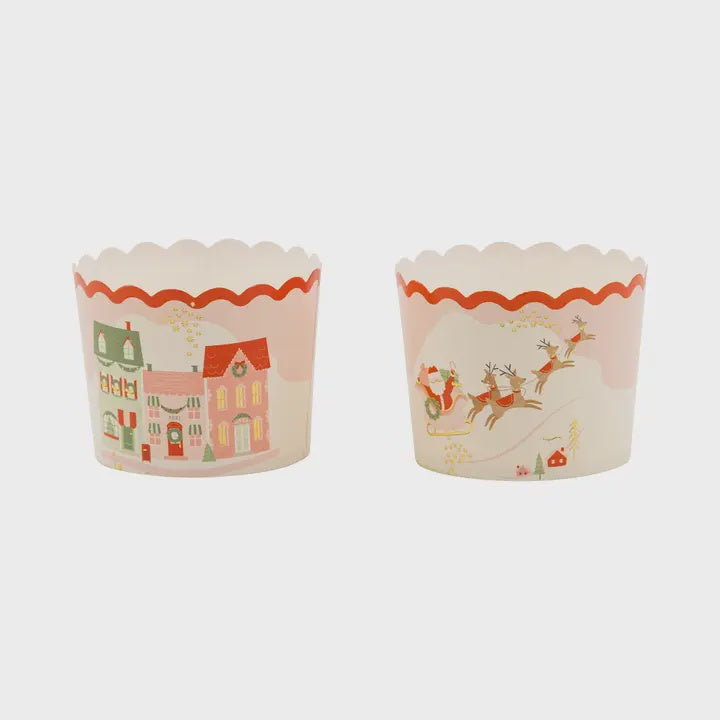 Add holiday magic to your party desserts with these 5 oz baking cups featuring Santa scenes and gold foil. Their festive shine brings a joyful sparkle to cupcakes and treats, making your holiday spread unforgettable. Perfect for celebrating the season with style and cheer. • 50 baking cups in each box set • 25 of 2 coordinating designs. • cups are 5 oz • gold foil