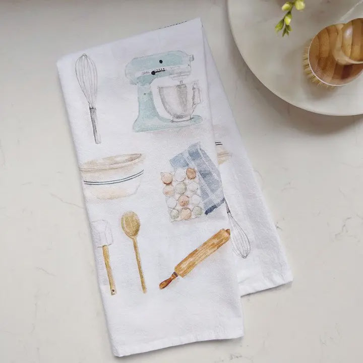 Add a touch of delight to your kitchen with this 100% cotton tea towel. Baking illustrations cover the towel making it perfect for washing up, lining a basket, or displaying. Pair with a favorite cookbook, fancy sea salt, or a set of wooden spoons for the perfect baking-inspired gift! Details: - 100% cotton flour sack tea towel - 19" x 28" - Loop for hanging - Machine wash and dry - Original watercolor artwork by Emily Lex